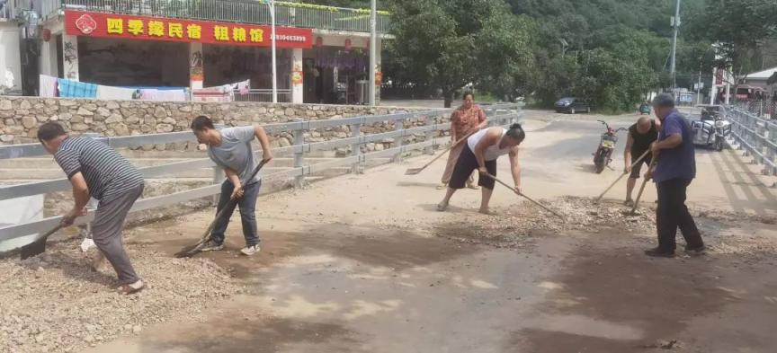 黄松峪乡村民不等不靠,自发参与环境卫生整治中,对房前屋后的泥沙、杂草等进行全面清理,以最快的速度恢复干净整洁的人居环境面貌,齐心协力重建美好家园。