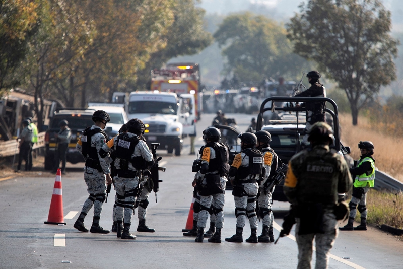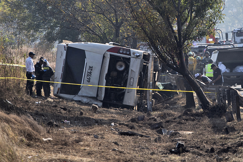 11月22日,在墨西哥米却肯州蒂里佩蒂奥附近公路上,应急人员在事故现场开展工作。