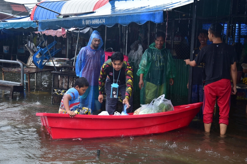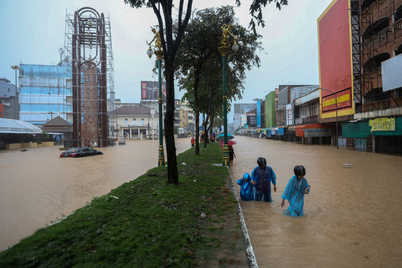11月22日,在泰国宋卡府,人们走在被洪水淹没的街道上。