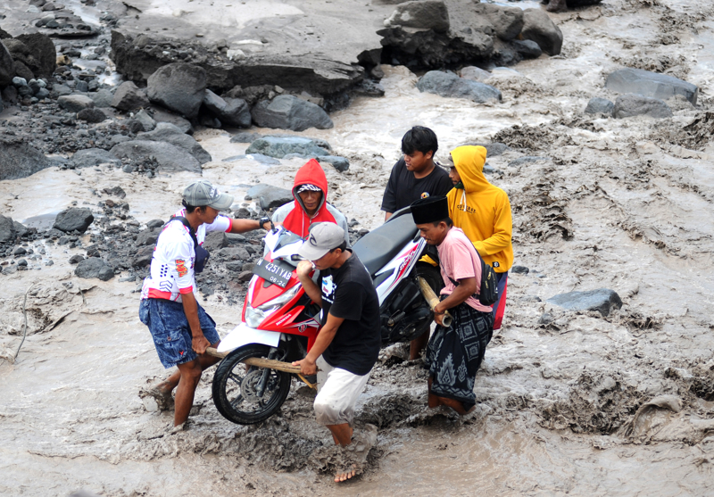 11月23日,在印度尼西亚东爪哇省,人们抬着摩托车穿过被火山灰覆盖的河滩。